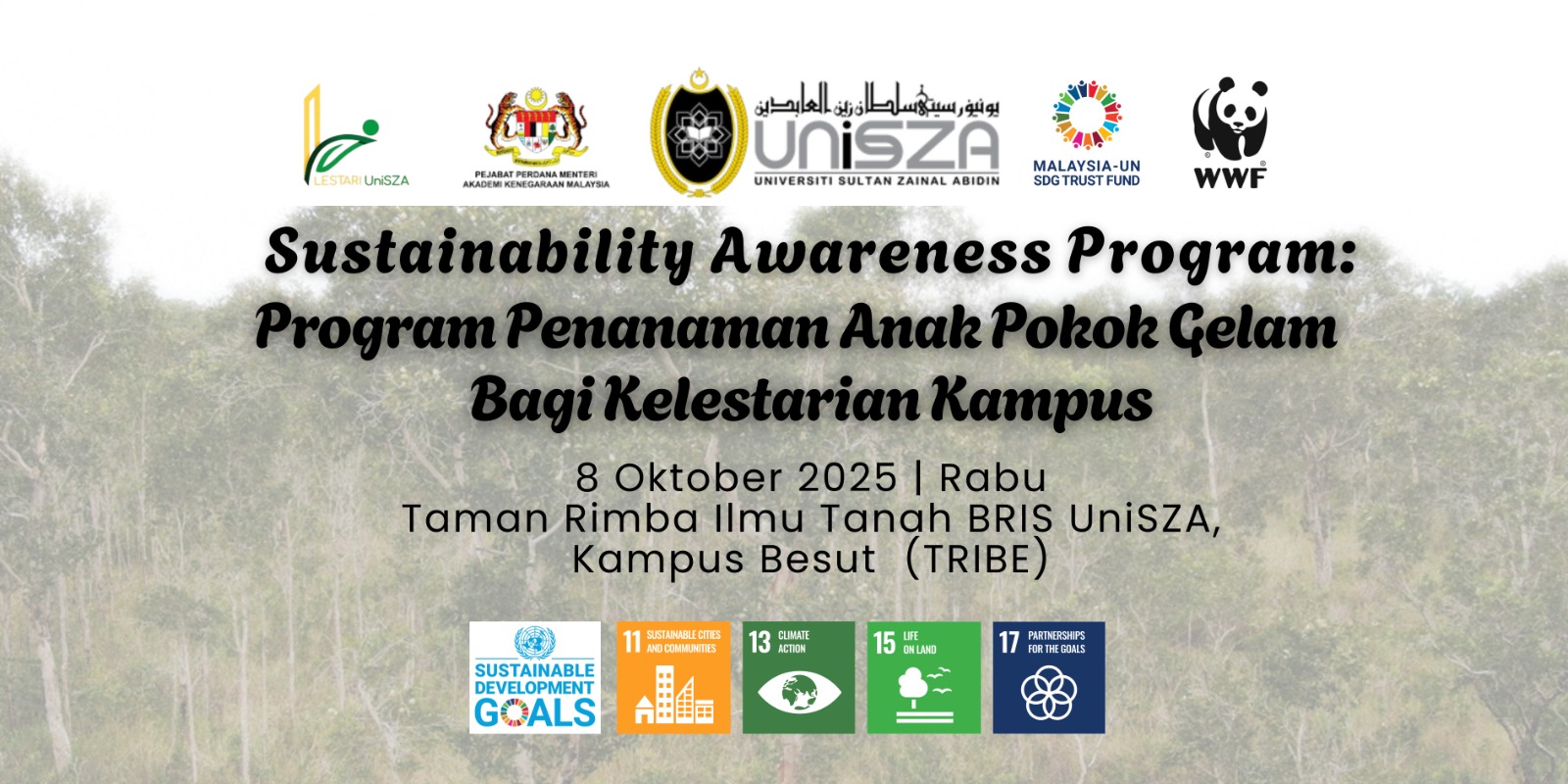 |   PENGANJURAN EAST COAST SUMMIT ON SUSTAINABILITY (ECSUGIC) SEMPENA FESTIVAL OF IDEAS (FoI) @ TERENGGANU 20255 Oktober 2025- Pejabat Pengarah Kampus Besut (PPKB) melalui Sekretariat Lestari UniSZA telah selesai melaksanakan penganjuran East Coast Summit on Sustainability (ECSUGIC) sempena Festival of Ideas (FoI) @ Terengganu 2025 di Dewan Perdana, Kampus Gong Badak.   PROGRAM SUSTAINABILITY AWARENESS PROGRAM: PROGRAM PENANAMAN ANAK POKOK GELAM DI UniSZA KAMPUS BESUTPROGRAM SUSTAINABILITY AWARENESS PROGRAM: PROGRAM PENANAMAN ANAK POKOK GELAM DI UniSZA KAMPUS BESUT 8 Oktober 2025 (Rabu)- Pejabat Pengarah Kampus Besut dengan kerjasama Fakulti Biosumber dan Industri Makanan dan World Wide Fund for Nature (WWF) telah mengadakan Sustainability Awareness Program: Program Penanaman Anak Pokok Gelam di UniSZA Kampus Besut. Seramai 200 orang penyertaan yang melibatkan pelajar dan staf di UniSZA Kampus Besut. Program ini telah dirasmikan oleh YBhg. Dato’ Prof. Madya Ts. Dr. Mohd Hafiz bin Yusoff @ Che Abdullah, Timbalan Naib Canselor (Hal Ehwal Pelajar dan Alumni). Turut hadir program tersebut dan pegawai-pegawai kanan di UniSZA Kampus Besut.   PELANJUTAN TARIKH TUTUP PENYERTAAN BAGI 🌿 *Green Innovations Competition (ECSUGIC) 2025PELANJUTAN TARIKH TUTUP PENYERTAAN BAGI 🌿 *Green Innovations Competition (ECSUGIC) 2025 Kini Dibuka untuk Penyertaan!🌿 Jom sertai Green Innovations Competition (ECSUGIC) 2025 sempena Festival of Ideas (FoI) @ Terengganu 2025 di UniSZA! 💡 Ada idea inovasi hijau yang mampu ubah dunia? ♻️ Nak tonjolkan solusi kelestarian yang kreatif dan berimpak tinggi? Ini peluang anda untuk menyerlah! 🏆 Hadiah dan Sijil Penyertaan menanti! 📅 Tarikh tutup penyertaan (Baru): 9 Oktober 2025 / Khamis* 📍 Lokasi: Dewan Perdana, UniSZA Kampus Gong Badak, Terengganu   Green Innovations Competition (ECSUGIC) 2025 Kini Dibuka untuk Penyertaan!Jom sertai Green Innovations Competition (ECSUGIC) 2025 sempena Festival of Ideas (FoI) @ Terengganu 2025 di UniSZA! 💡 Ada idea inovasi hijau yang mampu ubah dunia? ♻️ Nak tonjolkan solusi kelestarian yang kreatif dan berimpak tinggi? Ini peluang anda untuk menyerlah! 🏆 Hadiah dan Sijil Penyertaan menanti! 📅 Tarikh tutup penyertaan: 5 Oktober 2025 / Ahad* 📍 Lokasi: Dewan Perdana, UniSZA Kampus Gong Badak, Terengganu |